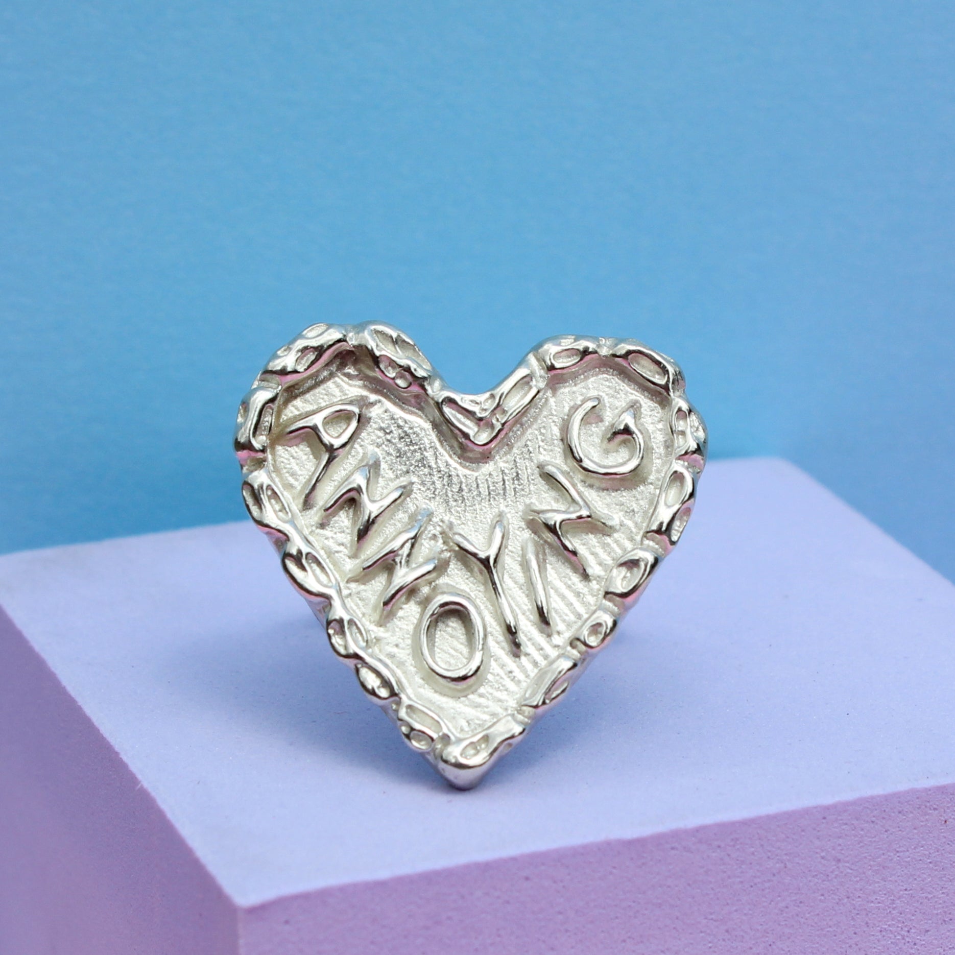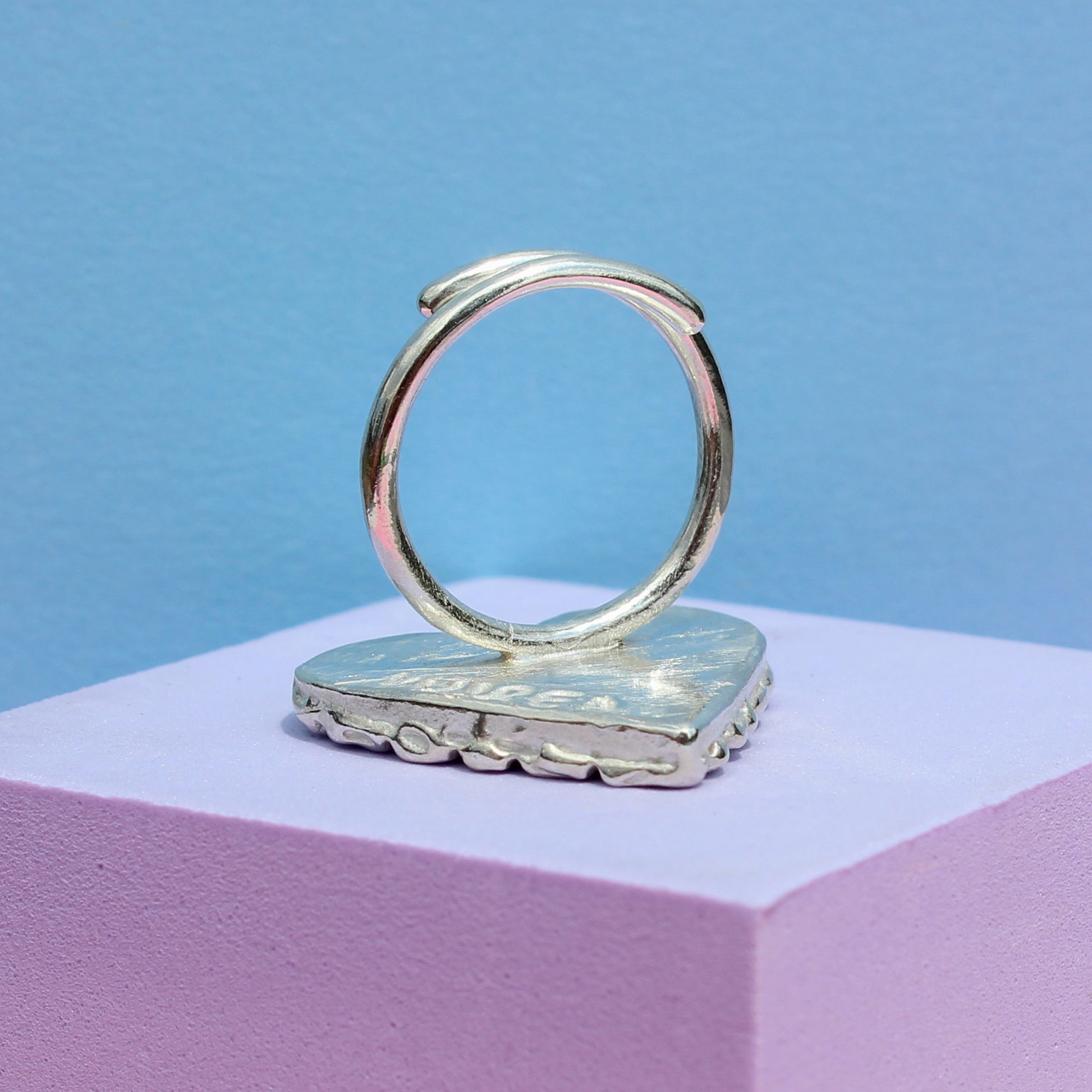 Made with the ancient lost wax technique, this ring features a textured satin-finish center with contrasting high polish text, framed by a high-shine bamboo-inspired border.