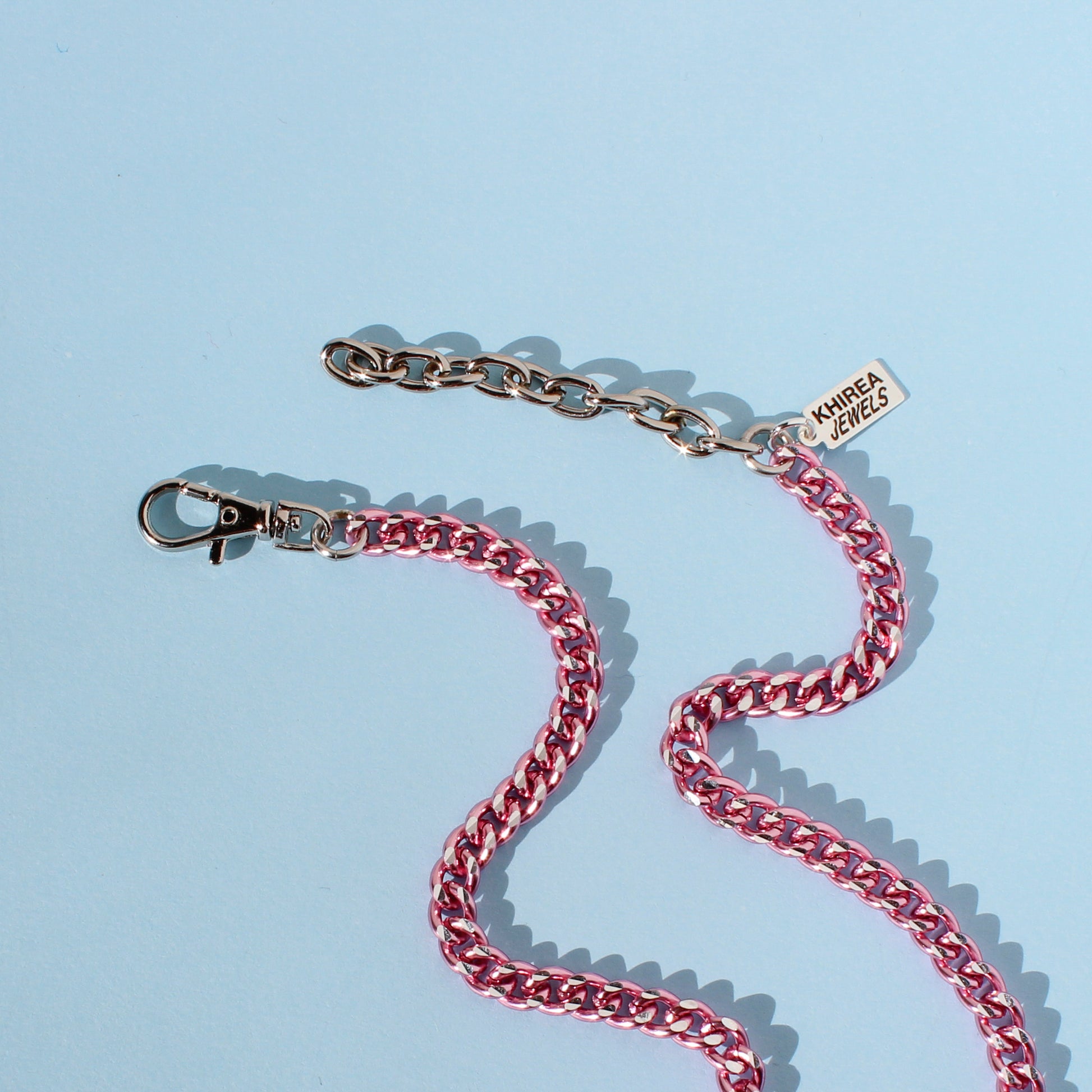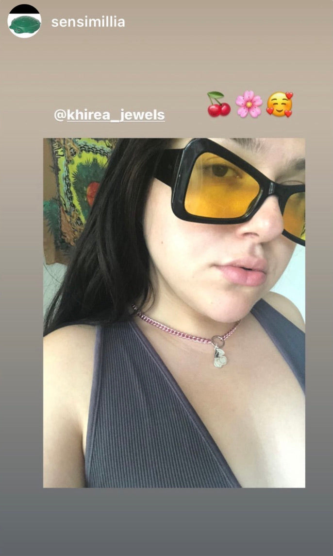uniquely hand-carved sterling silver cherry signature charm on lightweight anodized pink diamond cut curb chain, with adjustable length of 15"-17" 🍒