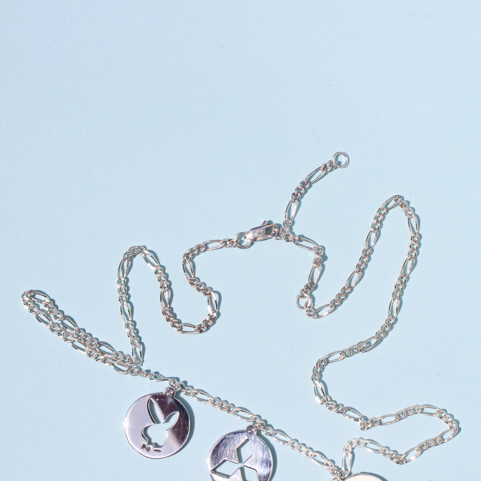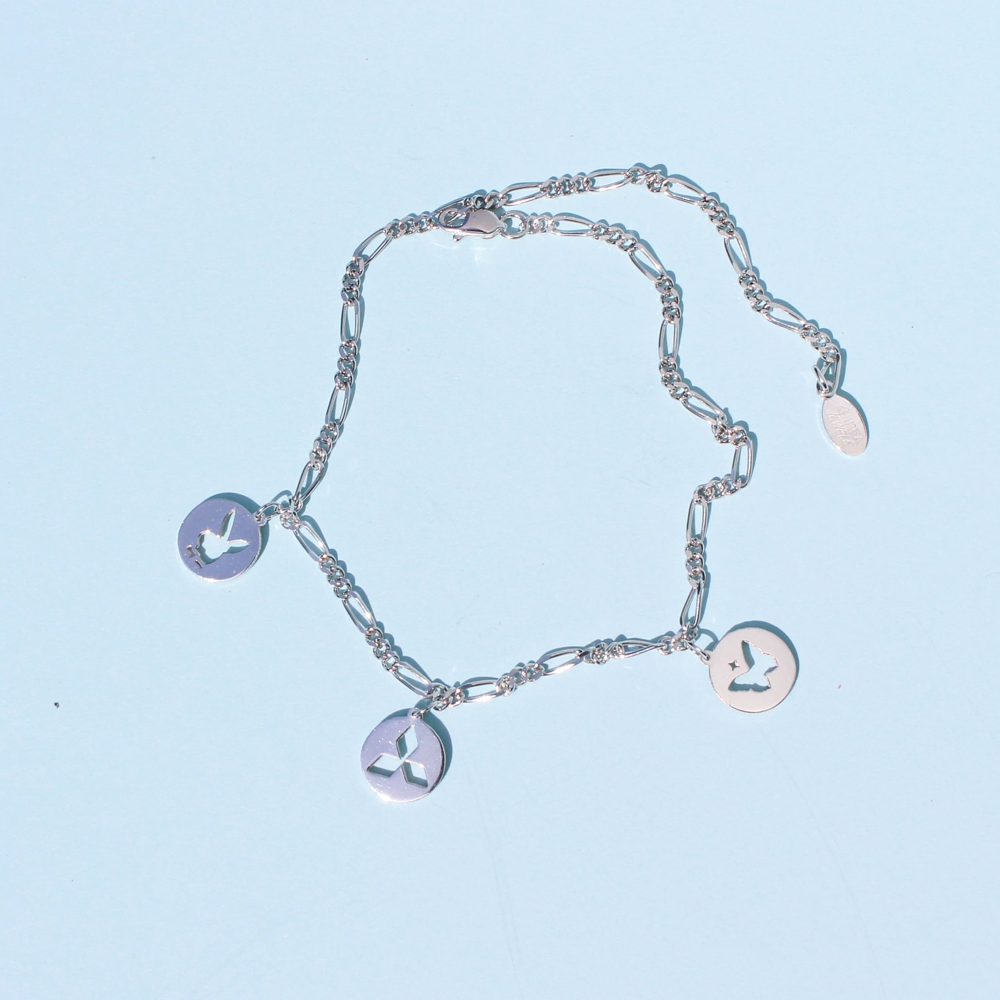 Sterling silver high-polish anklet featuring my fave e-pill motifs. Adjustable to 10 inches.