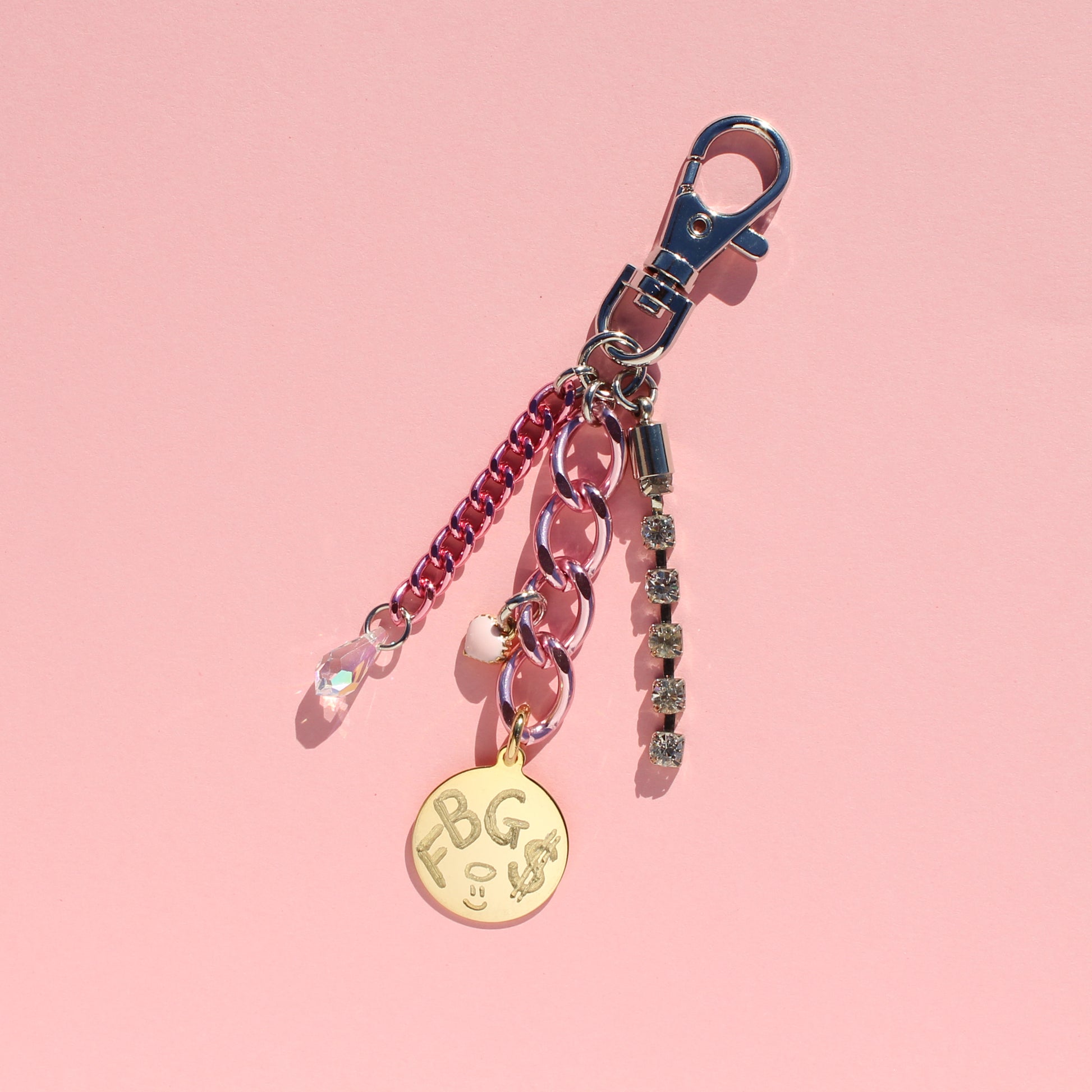 Dog tag with signature alternative engraving on anodized pink aluminum links, with charms and crystal chain, plus a lil Swarovski crystal. This guy is on a clip, so you can add to keychains, o-ring chokers, your bag, or whatever.