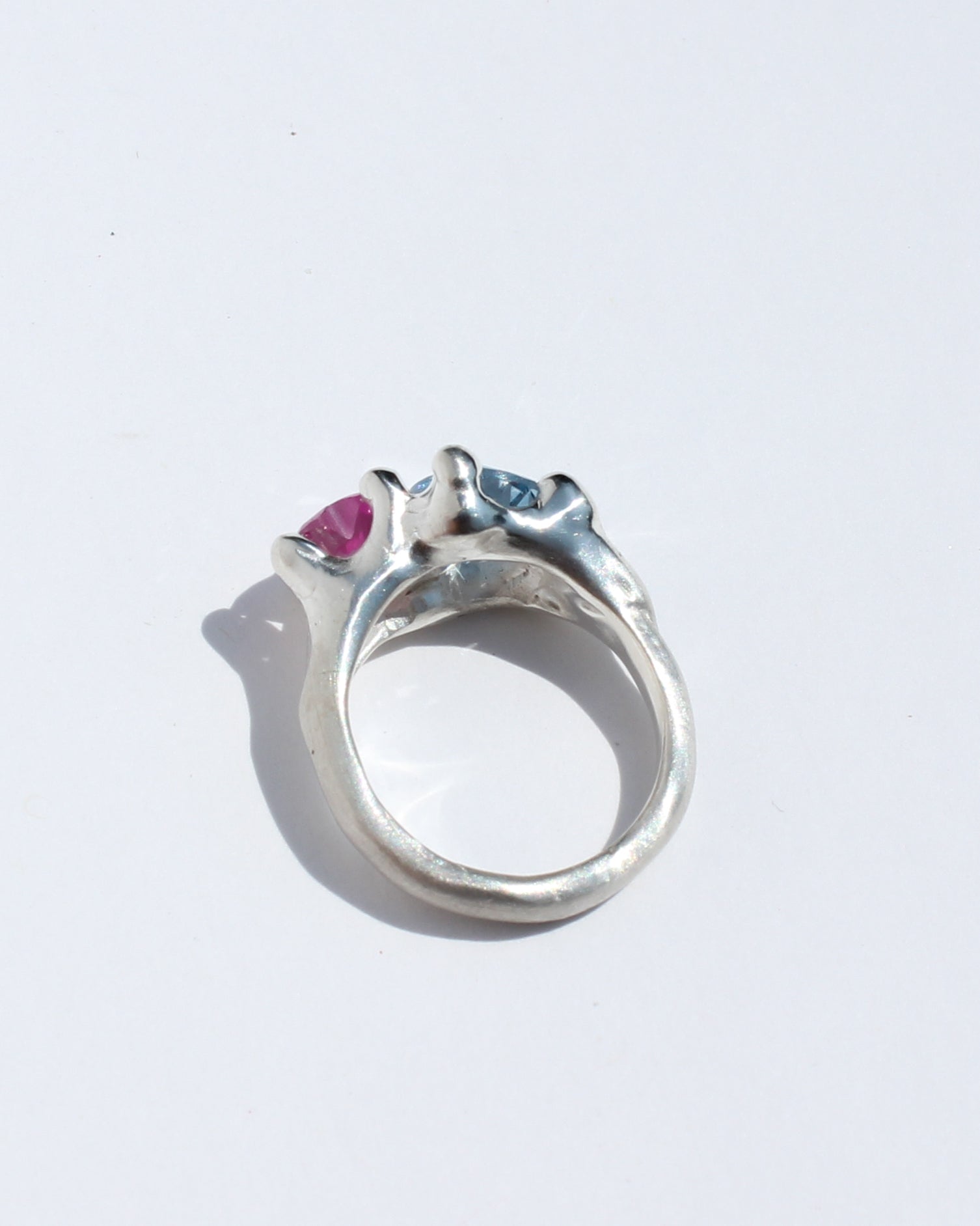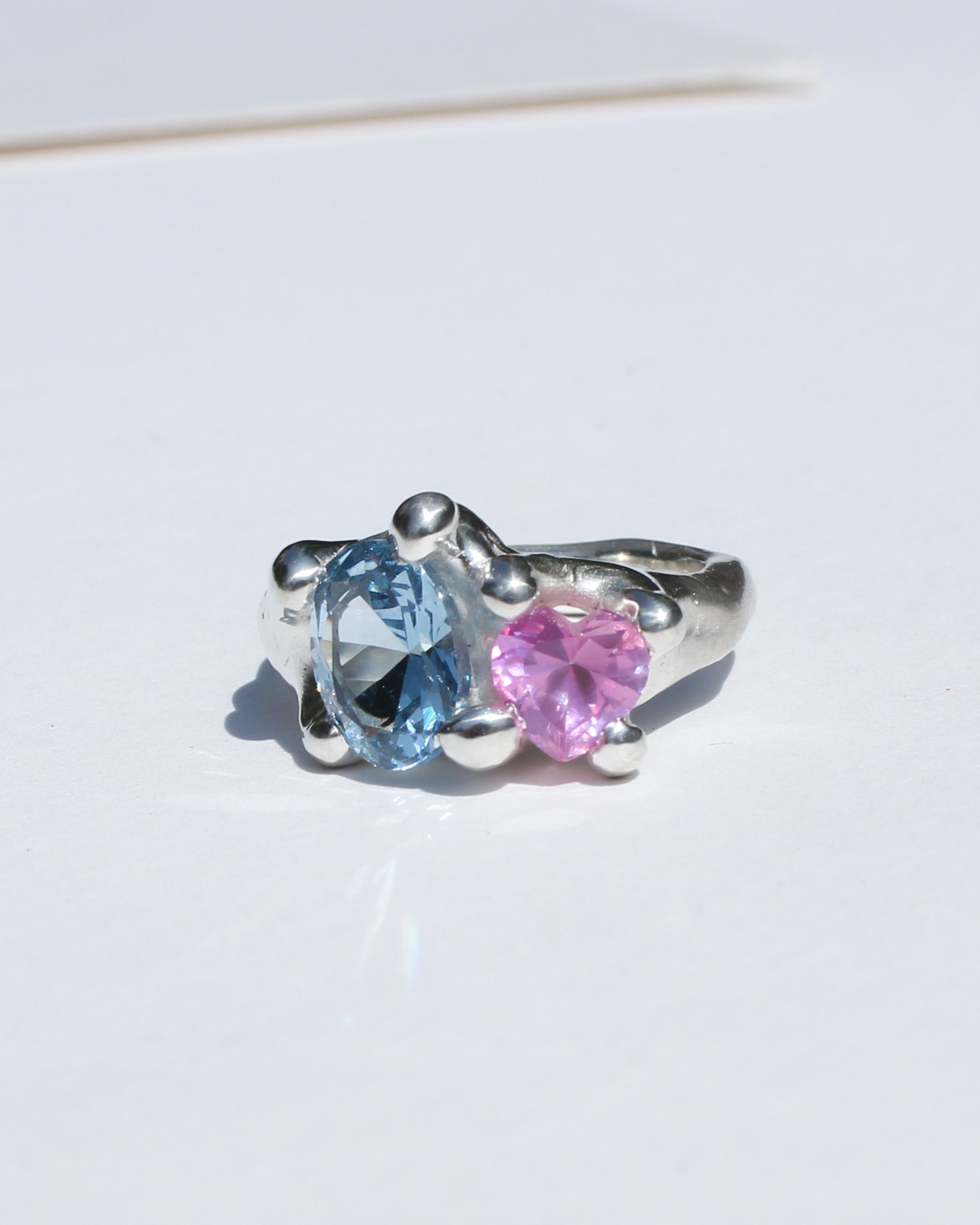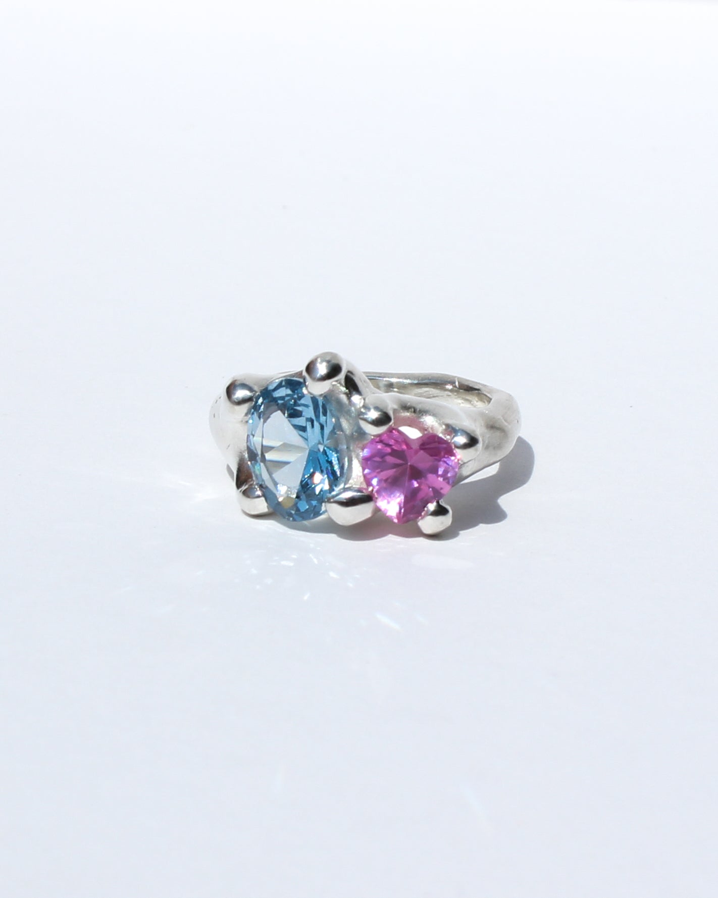Materials: Simulated aquamarine corundum, simulated pink tourmaline corundum, and sterling silver.