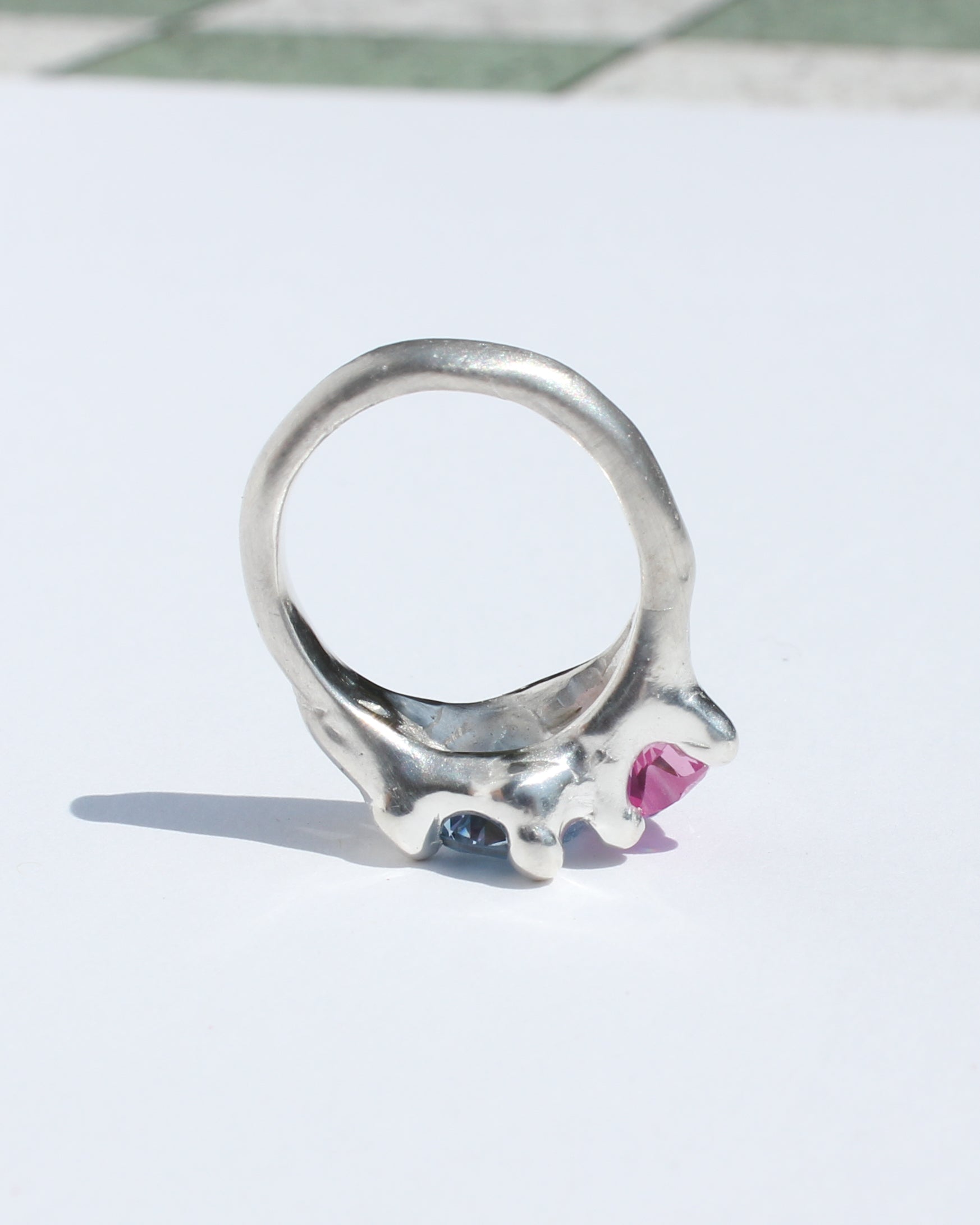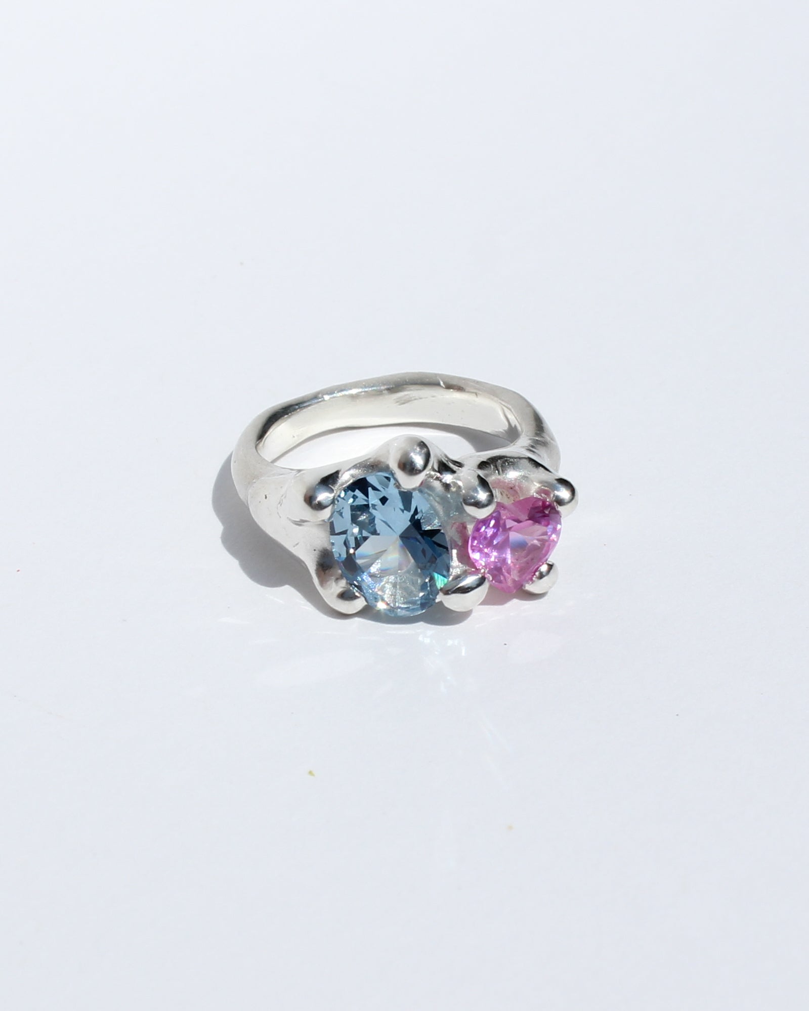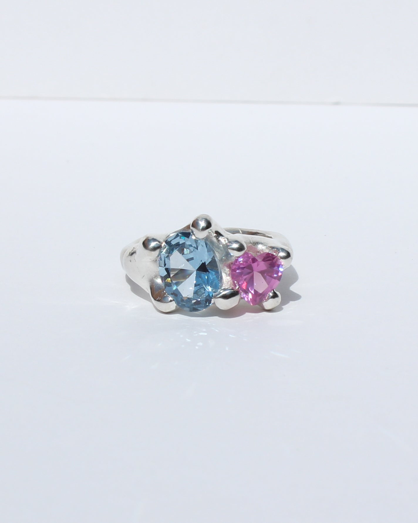 Materials: Simulated aquamarine corundum, simulated pink tourmaline corundum, and sterling silver.