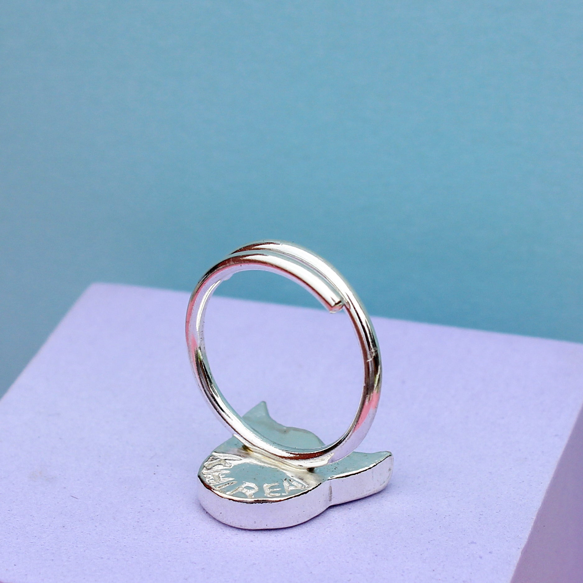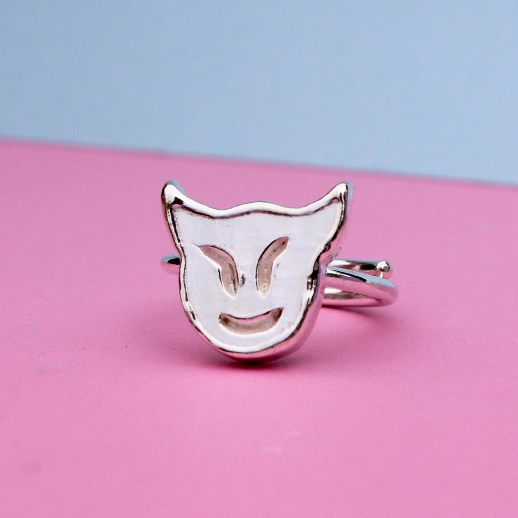 This lil demon is made with the ancient lost wax technique, and features a high polished outside with a satin finish center. The silver version has great contrast from the polishing technique, and the brass has hand-darkened details.