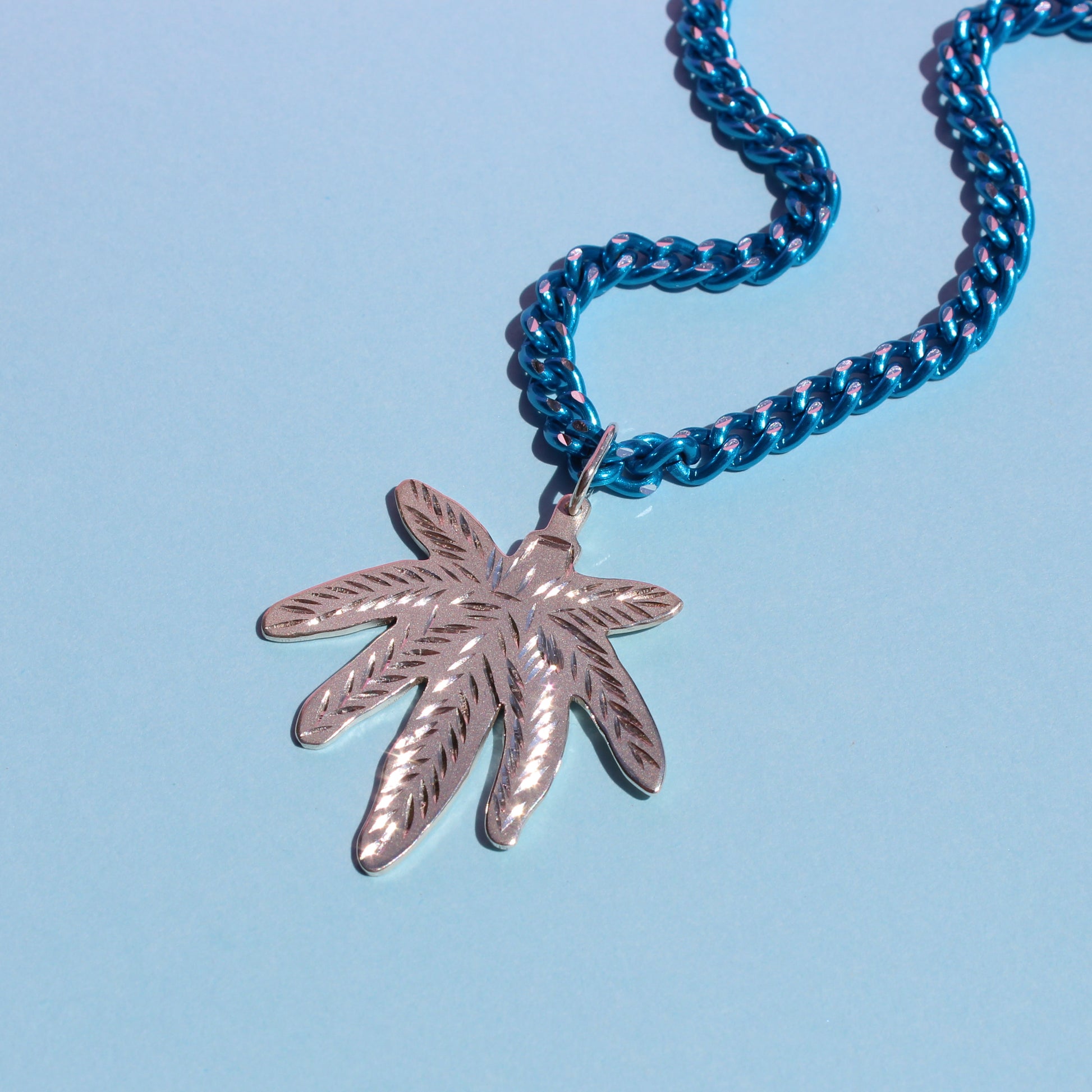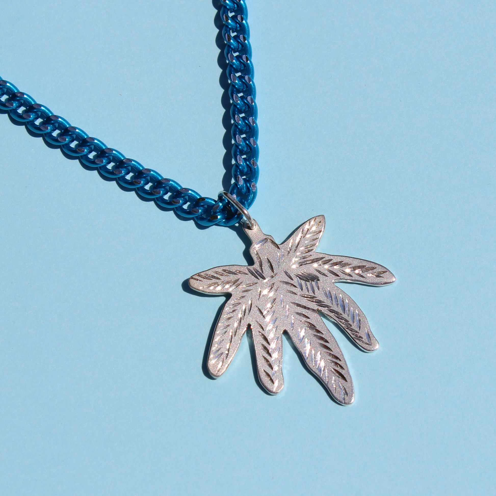 sample quality (experimental finishing). large sterling silver weed leaf pendant on lightweight bright blue anodized diamond cut aluminum curb chain with extender. the pendant is sand blasted with diamond cuts and is removable from the chain. adjustable 16"-19".