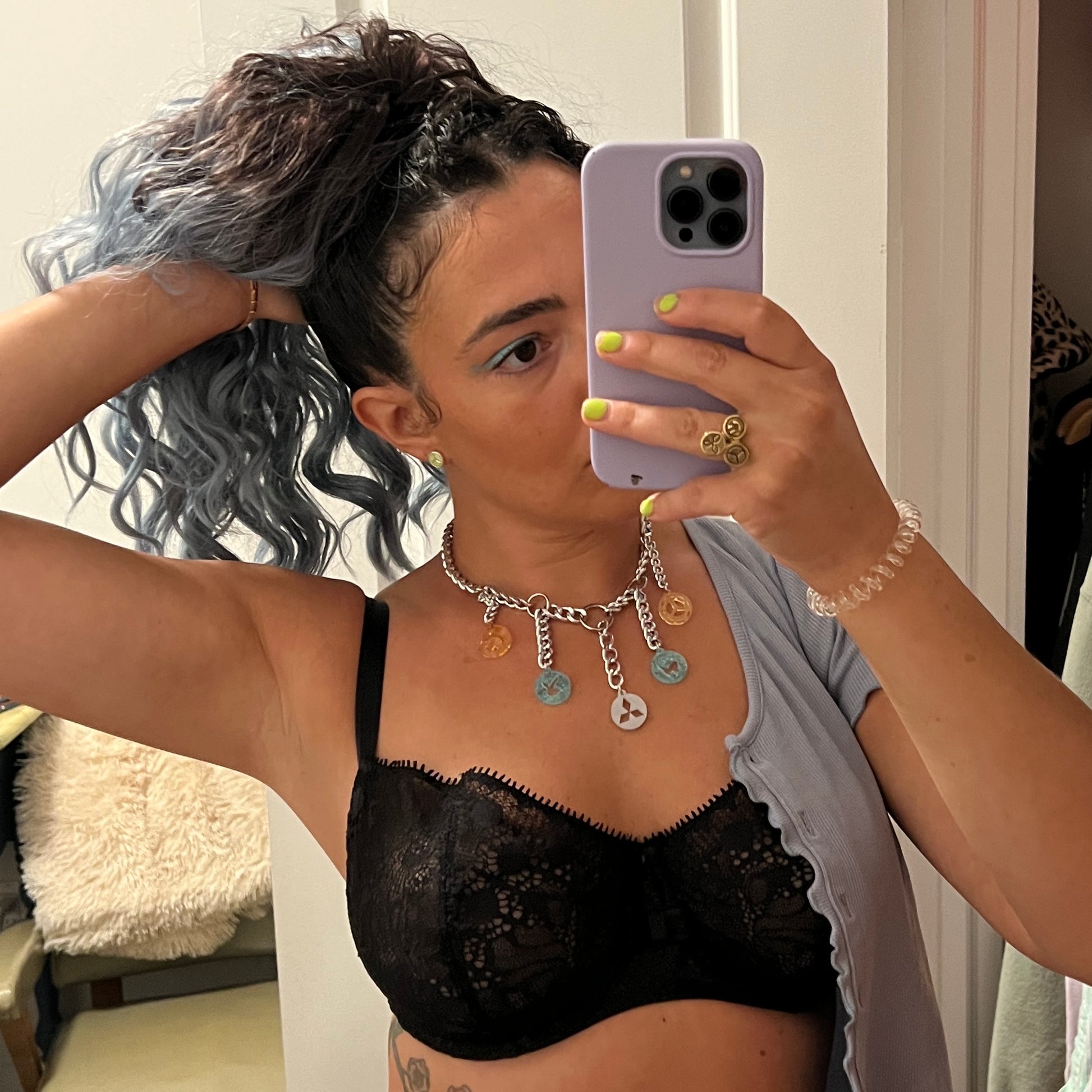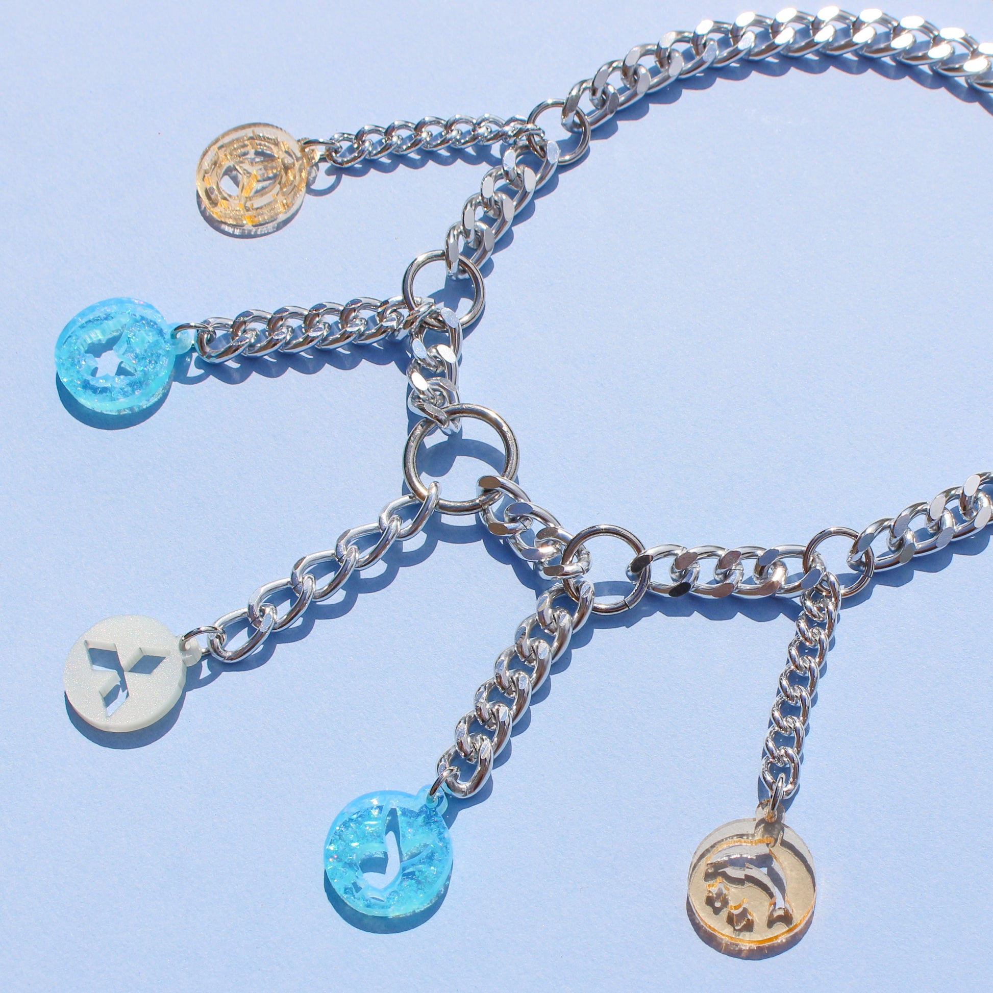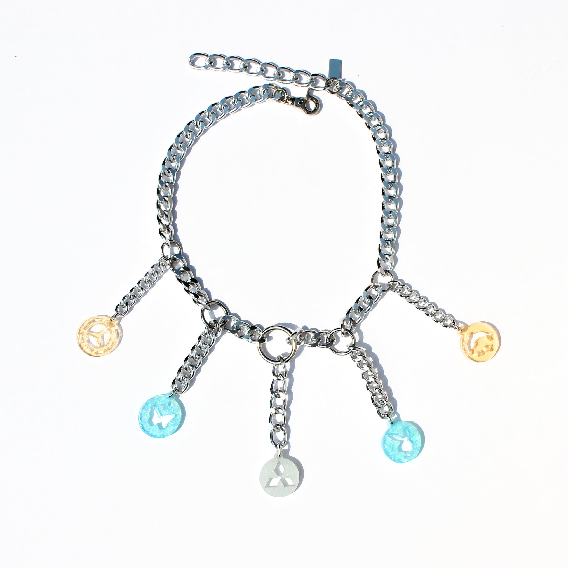 One of a kind. Ridiculously sexy silver-toned necklace with colorful and sparkly acrylic pieces featuring my fave e-pill motifs, hand-drawn by me.