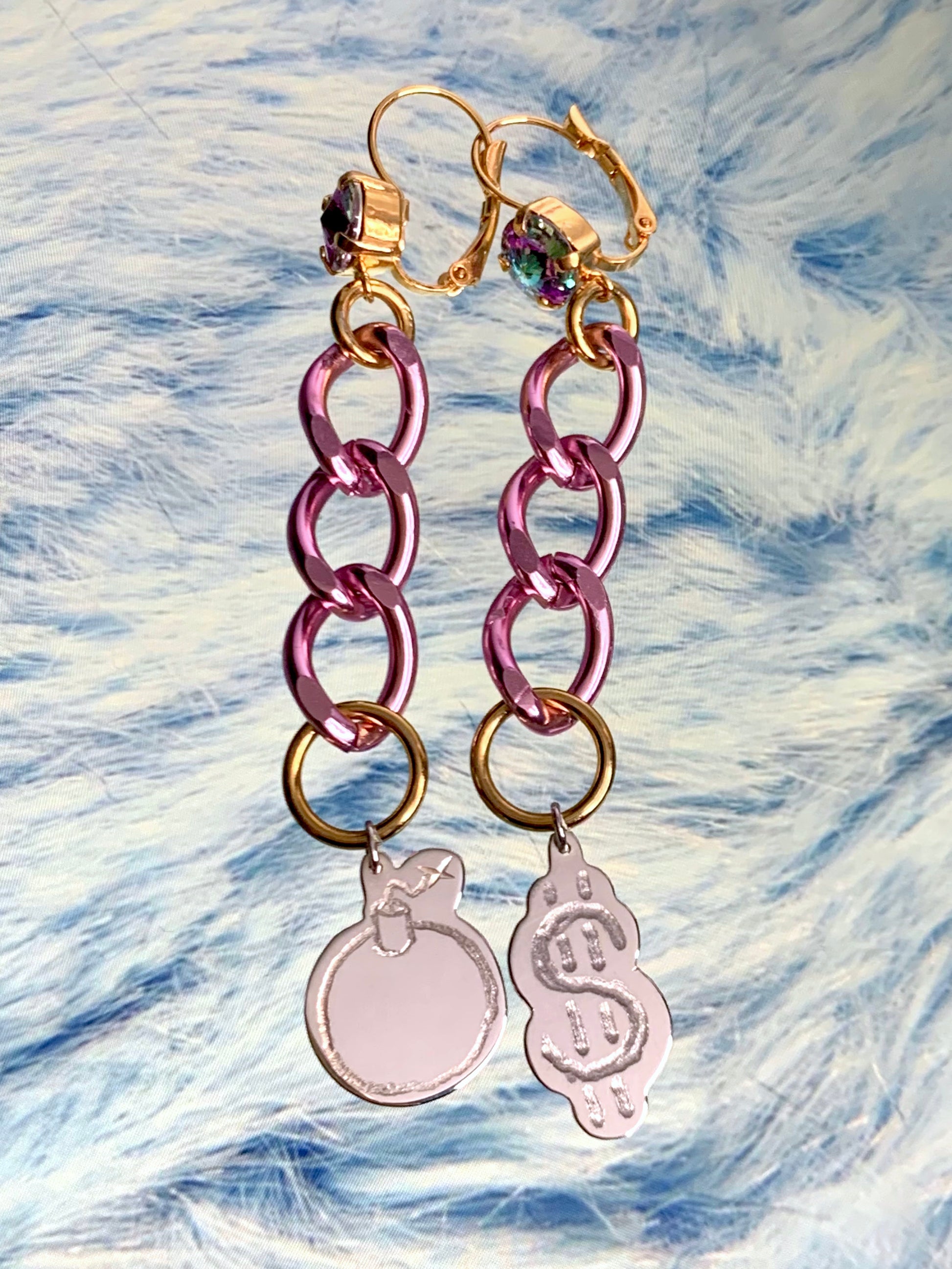mix and match charm earrings; features gold-toned lever back ear hook with 𝘚𝘸𝘢𝘳𝘰𝘷𝘴𝘬𝘪 stones, lightweight pink anodized curb chain, gold hardware, and two sterling silver signature charms of your choice :)