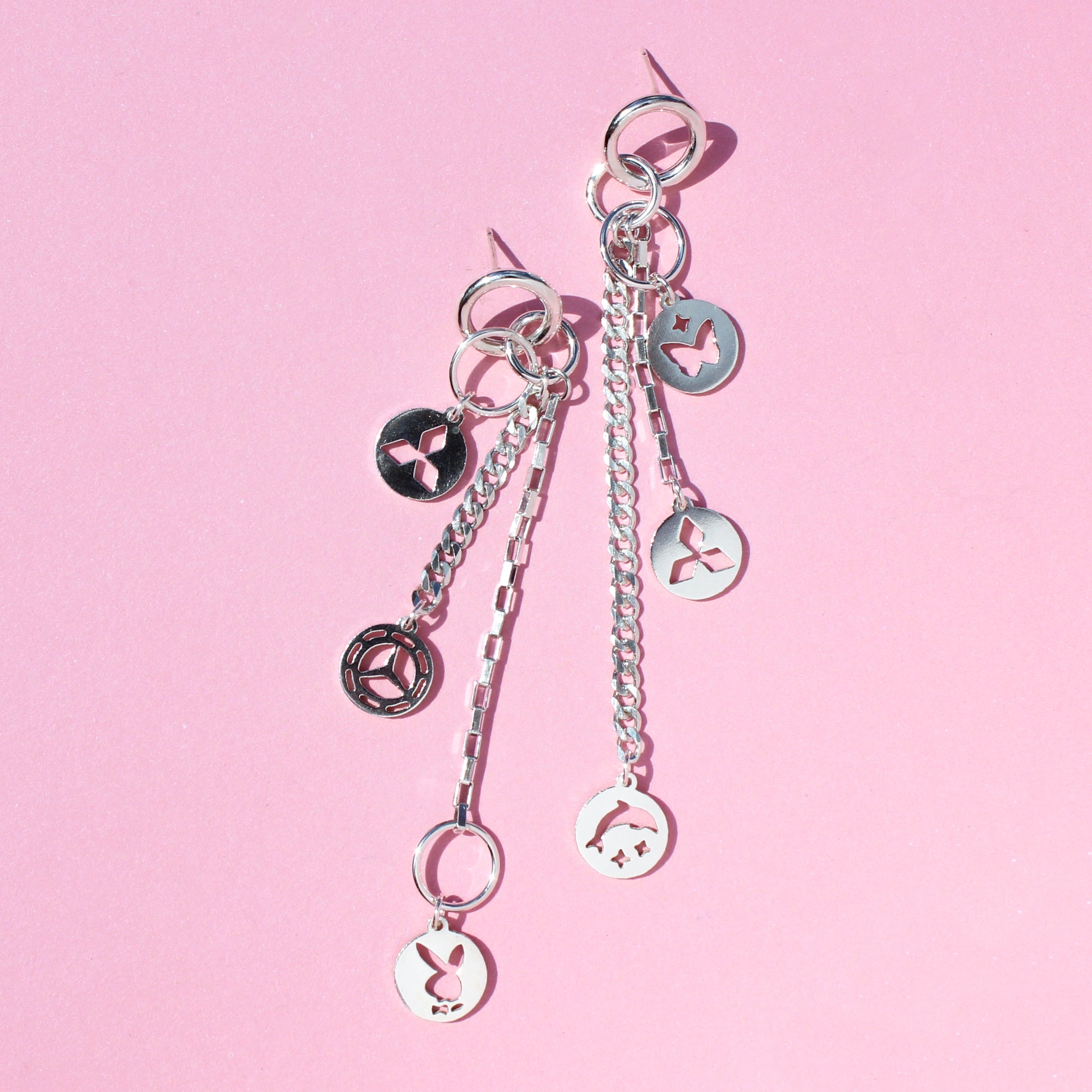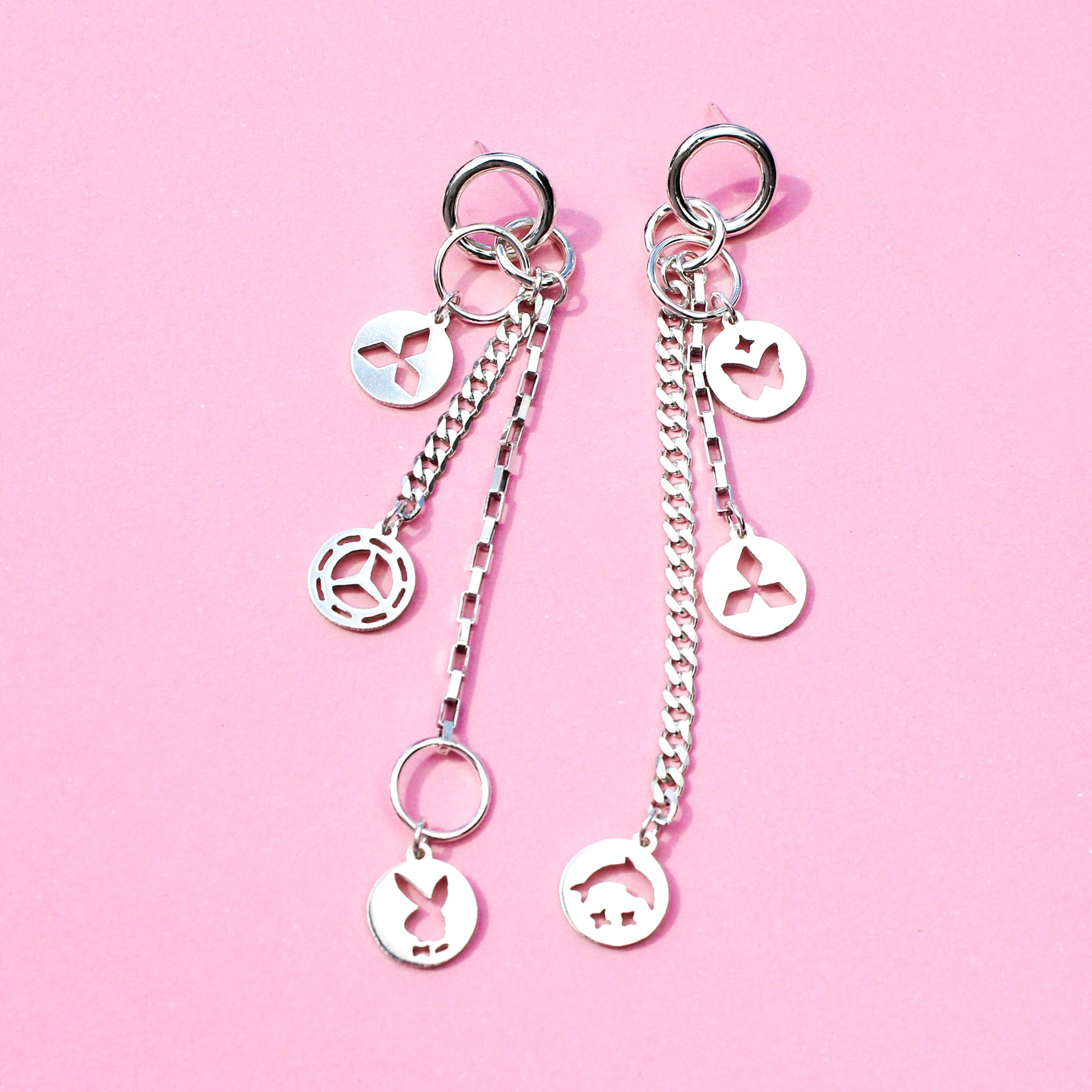 So obsessed with these one of a kind dangly earrings featuring true-to-size e pill motifs. Solid sterling silver. These hang 3.5 inches long.