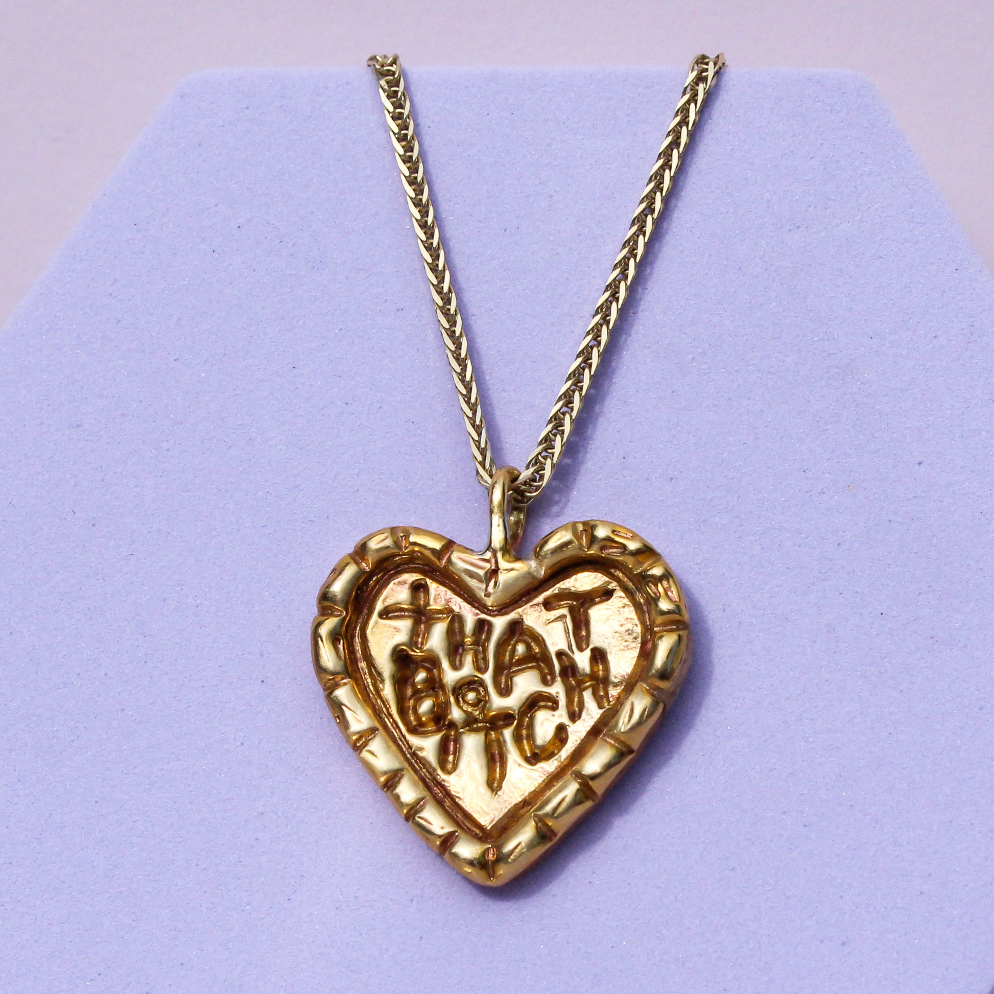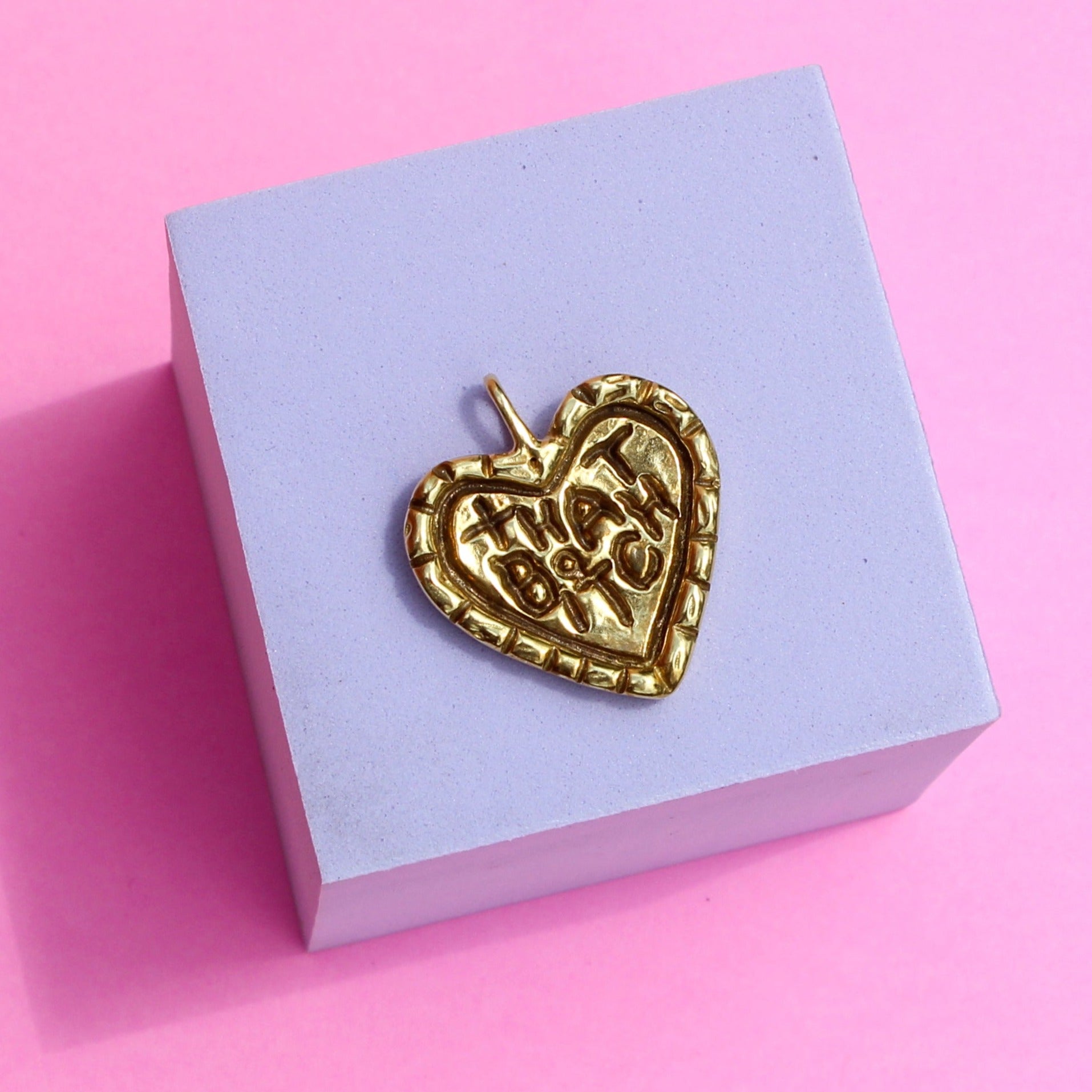 This puffy-effect heart pendant, made with the ancient lost wax technique, features hand blackened text and a satin finish center, framed by a high-shine bamboo-inspired border. (They'll def be able to read it.)