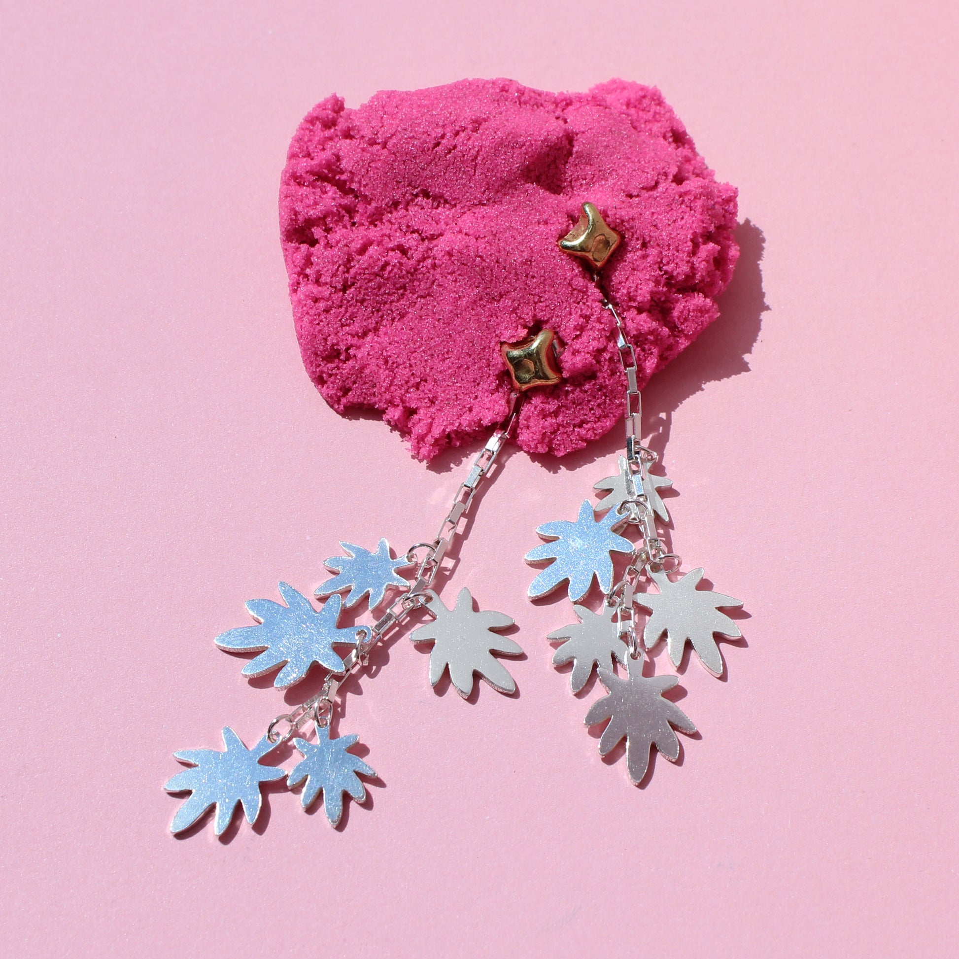 The cutest 1 of 1 pair of dangly weed leaf earrings in sterling silver hanging from lil brass studs. One of a kind.